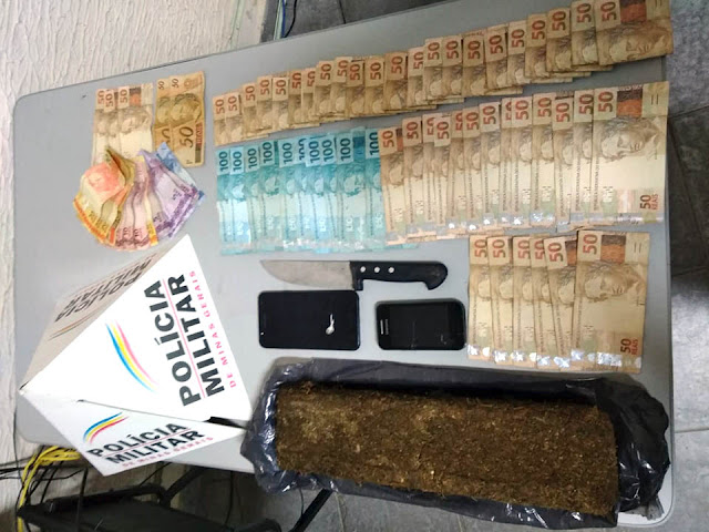 Mais adiante, o veículo foi abordado e após busca, foi encontrada dentro de um aparelho celular, uma droga sintética, conhecida como "doce", a qual o jovem de 24 anos disse ser para seu consumo. Com os indivíduos, também foi apreendida a quantia de R$ 3.539,00 em dinheiro. Eles disseram que estavam indo para Itamarati de Minas onde pretendiam comprar um veículo. Dentro do Fiat Pálio os policiais encontraram também uma mochila vazia com forte odor de maconha, além de pedaços de papel alumínio.